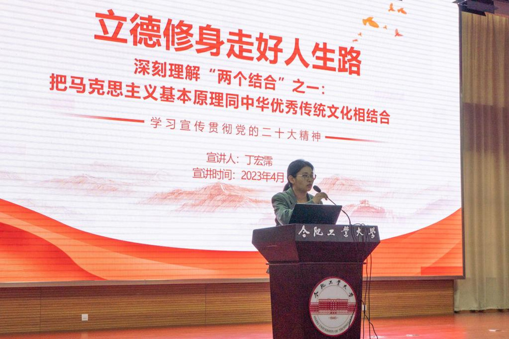 At the end of the meeting, Ding Hongpei, a member of the school's preaching team for the 20th National Congress of the Communist Party of China, gave a speech titled "Cultivating Morality and Walking the Right Path in Life." He shared how to integrate the values of scientific socialism with personal, family, and social aspects, and encouraged students to combine the basic principles of Marxism with excellent traditional Chinese culture. He urged them to inherit and promote excellent Chinese traditional culture in their future life paths and contribute to the comprehensive construction of a socialist modernized strong country.