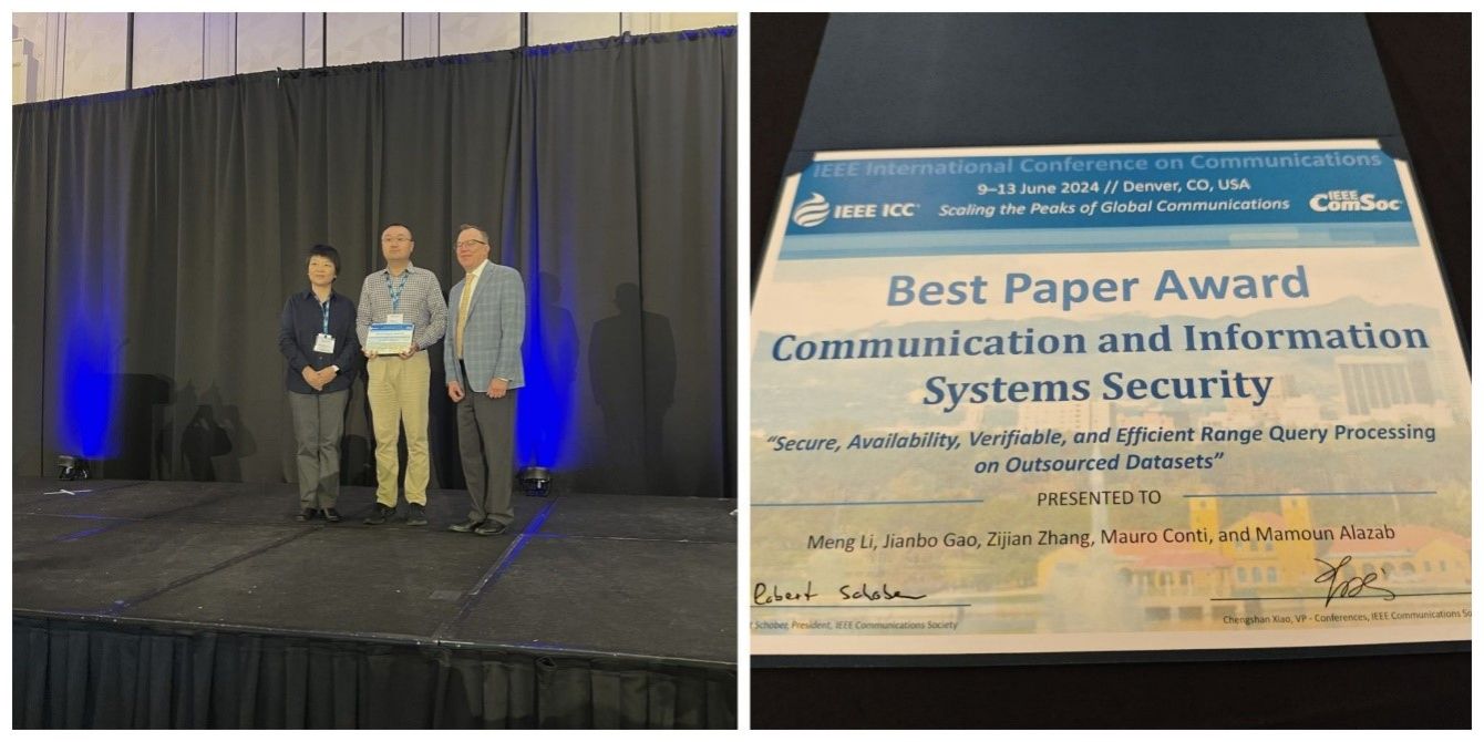 Recently, at the flagship conference in the field of communications, the IEEE International Conference on Communications (IEEE ICC) 2024, which was held in the United States, the research achievement "Secure, Availability, Verifiable, and Efficient Range Query Processing on Outsourced Datasets" by Associate Researcher Li Meng's team from our institute stood out among many papers and won the Best Paper Award at this conference. This is also the only paper in communication and information system security that received an award at this conference. The second author is Gao Jianbo, a master's graduate from our class of 2023, who is currently pursuing a Ph.D. at the School of Cyberspace Security, Beijing Institute of Technology. The paper focuses on the verifiable result problem of secure range queries. Range queries allow data users to outsource their data to cloud servers, which respond to data users submitting requests with range conditions. However, security issues have hindered its widespread use. Existing work ignores the availability of query items and fails to provide security verification protection, or sacrifices search accuracy for efficiency. This study proposes a secure, available, verifiable, and efficient range query scheme (SAVE) with three notable features: it checks the security usability against malicious cloud servers and designs a key-based indexing and secure verification mechanism to check the availability of matching nodes, including validity and freshness checks; it designs a targeted verification mechanism for the correctness and completeness of query results without compromising security; and it devises a layered encoding method to improve search efficiency and accuracy. The study formally states and proves the security of SAVE in the random oracle model and conducts extensive experiments on multiple datasets to verify its efficiency.