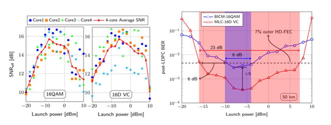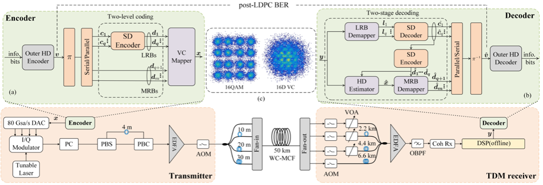 The awarded paper, titled "Experimental Demonstration of 16D Voronoi Constellation with Two-Level Coding over 50km Four-Core Fiber," addresses the advantages and challenges of capacity expansion in future multi-core fiber technology. The research proposes a novel multi-core fiber transmission method based on 16-dimensional joint coded modulation (MLC-16DVC) (as illustrated in Figure 1). Through a single-span 50km four-core fiber transmission experiment (experimental system shown in Figure 2), the proposed method demonstrated significant advantages over traditional two-dimensional independent QAM modulation. Specifically, it exhibited greater tolerance to inter-core signal-to-noise ratio (SNR) variations and achieved a 6dB optical power gain at the outer hard-decision error correction threshold (as shown in Figure 3).