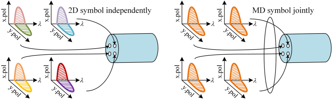 Figure 1: Schematic Comparison of Traditional Two-Dimensional Modulation and Multi-Dimensional Modulation in Four-Core Fiber Transmission Systems