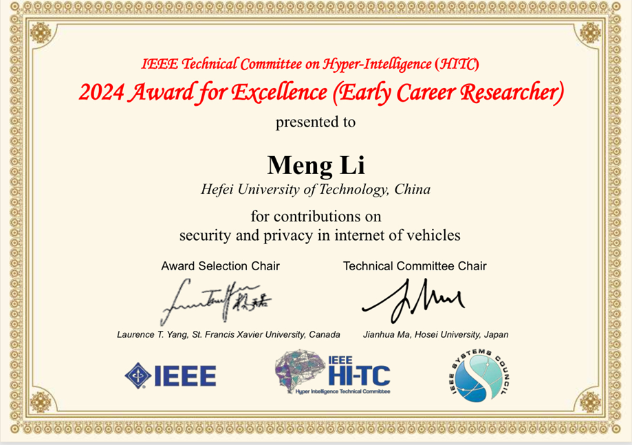 Recently, it was announced by the IEEE Hyper-Intelligence Technical Committee (IEEE HITC) that Associate Researcher Li Meng from our school has been awarded the 2024 IEEE HITC "Early Career Achievement Award" for Excellence in Early Career Research. This marks the first time a young scholar from our school has received this prestigious honor, highlighting the growing influence of our faculty in the international academic community, particularly in the field of cybersecurity.