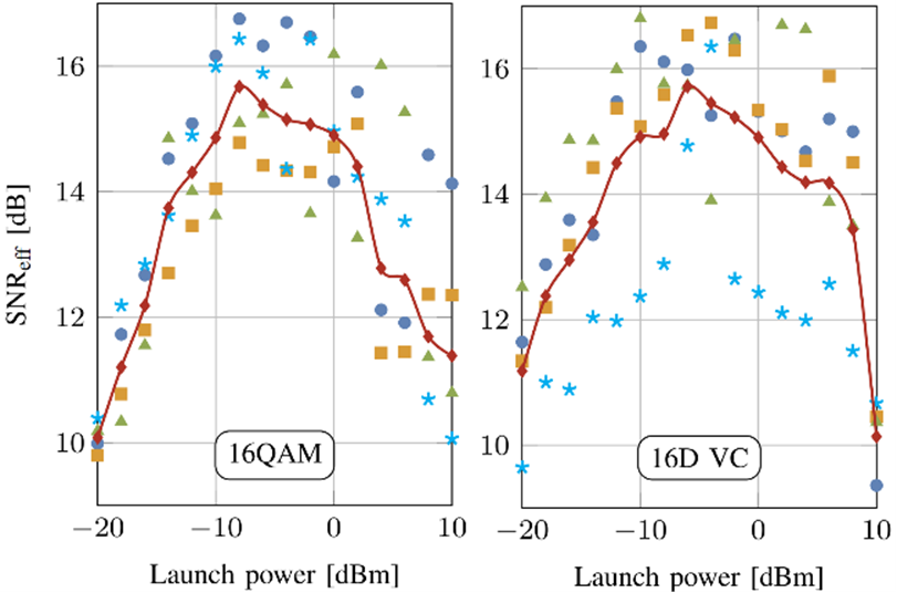 Figure 3: Effective SNR as a function of the launch power over 50 km transmission in WC-MCF