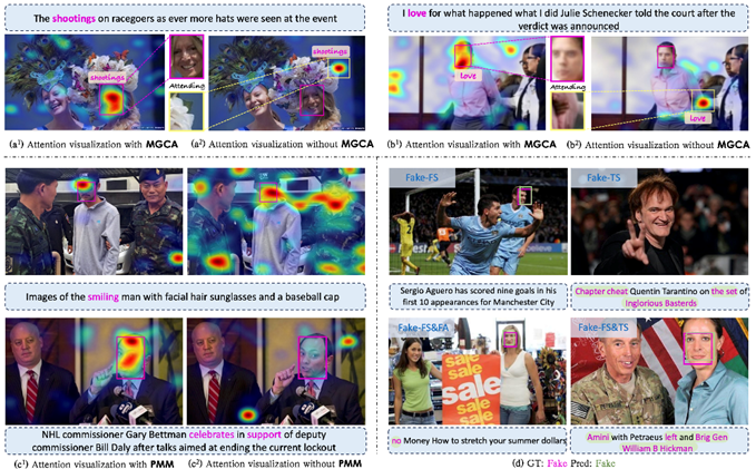 Figure 4. Effect of MGCA and PMM Loss on Attention Map Visualization. The red rectangle represents the bounding box of the manipulated face, and the red text indicates the manipulated word. (a) and (b) show the attention visualization between the manipulated word and the image. (c) shows the attention visualization between the entire sentence and the image. (d) presents the model’s prediction compared to the Ground Truth.