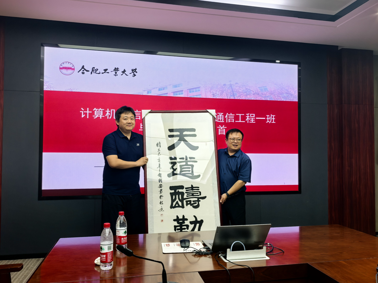 聚会后,学院为校友们准备了工大专属帆布包作为纪念,包身印有校名和校徽,承载着母校对学子的牵挂与祝福。校友们则向学院赠送了一幅《天道酬勤》书法作品,由年书记代为接收。作品既表达了二十载师生情的深厚绵长,也寄托了校友们对学院未来发展的美好期许。